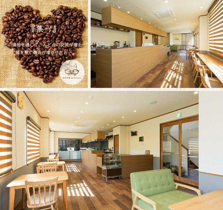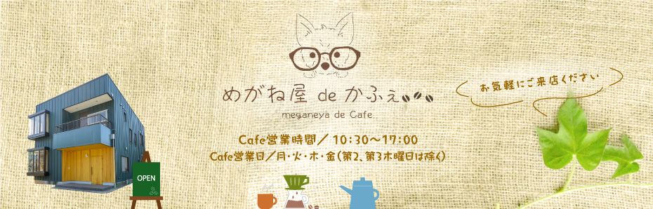 「めがね屋 de かふぇ」は、越前めがねの里の敷地内にOPENしたおしゃれなカフェスペースです。ご来店いただいた際に気軽にお立ち寄りください。カフェスペースのみのご利用もできます。おいしいお飲み物とスイーツ、軽食をご用意して皆様のお越しをお待ちしております。